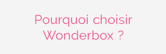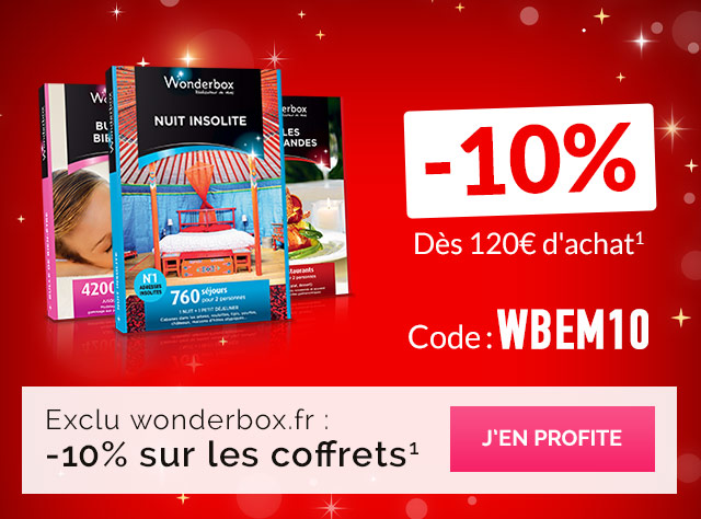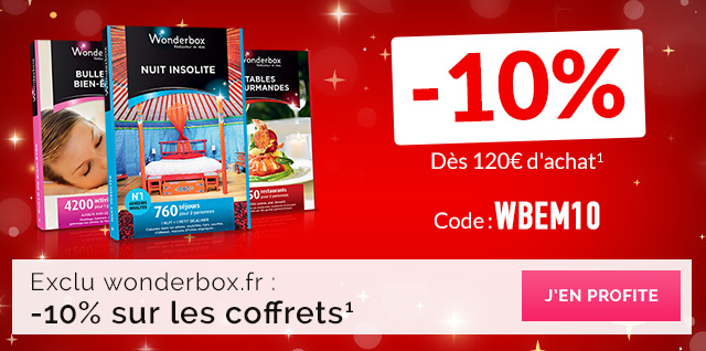 | 1 Bénéficiez de 10% de réduction immédiate sur tous les coffrets, pour tout achat d'un montant minimum de 120 € sur www.wonderbox.fr réalisé jusqu'au 7 décembre inclus, en indiquant le code de réduction WBEM10 lors de la passation de la commande. Un seul code par commande Wonderbox. Offre non cumulable avec toute autre offre promotionnelle. 2 En colissimo, dès 49,90€ d'achat, hors échange et prolongation. 3 Pour bénéficier du paiement en 3xCB , le montant de votre commande doit être compris entre 90 € et 1000 €. Vous devez être majeur et résider en France Métropolitaine. Votre carte bancaire doit avoir une date d'expiration supérieure à la date de la 3ème échéance programmée. Les cartes Electron, Maestro, e-CB, CB pré-payées et American Express ne sont pas acceptées. 4 Les Produits Wonderbox (hors Chèques Barrières et Coffrets 3 mois d'abonnement) dont la date limite d'utilisation est postérieure au 31/03/2016 sont échangeables ou prolongeables sans frais et de façon illimitée. Voir CGV, article 7 MULTIPASS, S.A.S - capital de 35 820 € - RCS Paris B 479 678 153 - siège social: 34, Avenue des Champs Elysées, 75008 Paris - société du groupe WONDERBOX SAS - capital de 10.600.000 € - RCS Paris B 508 244 548 |  |