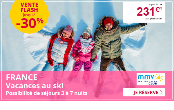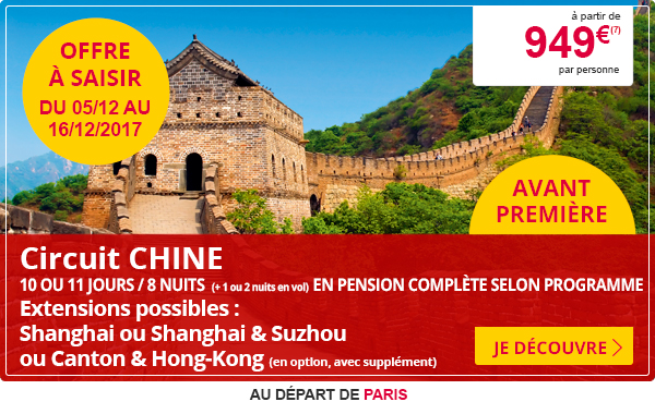 | (1) Prix par personne à partir de, base chambre double. Séjour 3 nuits en pension complète à l'hôtel club MMV Le Flaine. Non compris : le transport, les dépenses personnelles, les assurances Mondial Assistance. Prix établis au 23/11/17. (2) Prix par personne à partir de, base cabine double. Croisière 7 nuits en pension complète. Non compris : les dépenses personnelles, les assurances Mondial Assistance. Prix établis au 21/11/17. (3) Prix par personne à partir de, base chambre double. Séjour 7 nuits en formule tout inclus. Non compris : les dépenses personnelles, les assurances Mondial Assistance. Prix établis au 21/11/17. (4) Prix par personne à partir de, base chambre double. Séjour 3 nuits en petit déjeuner. Non compris : les dépenses personnelles, les assurances Mondial Assistance. Prix établis au 21/11/17. (5) Prix par personne à partir de, base chambre double. Séjour 7 nuits repas selon programme. Non compris : les dépenses personnelles, les assurances Mondial Assistance. Prix établis au 21/11/17. (6) Prix par personne à partir de, base chambre double. Circuit 8 nuits (+2 nuits en vol) repas selon programme. Non compris : les dépenses personnelles, les assurances Mondial Assistance. Prix établis au 21/11/17. (7) Prix par personne à partir de, base chambre double au départ de Paris, à certaines dates, sur vols réguliers Lufthansa (via Munich et / ou Francfort). Circuit 10 ou 11 jours/ 8 nuits (+ 1 ou 2 nuits en vol), en pension complète (du déjeuner du 2e jour au petit déjeuner du 10e jour). Transferts, hébergements en hôtels 3* (normes du pays), excursions et visites mentionnées au programme, les trains de nuit Pékin/Xi'an et Xi'an/Shanghai en couchette molle 1ère classe, les services de guides locaux de 2 à 9 personnes et d'un accompagnateur parlant français à partir de 10 personnes, taxes et services hôteliers, taxes d'aéroports, de sécurité obligatoires et surcharge carburant (377 € au 25/09/17, révisables) inclus. Non compris : les préacheminements de province, le visa obligatoire (de 126 € par personne (à ce jour) à faire par vos soins ou 160 € par personne et 26 € par dossier de frais de dossier (à ce jour) via le service visa Visiteurs, les extensions Shanghai & Suzhou et Canton & Hong-Kong, les pourboires obligatoires, le supplément chambre individuelle, les dépenses personnelles, les visites optionnelles, les boissons et les assurances Mondial Assistance (8) Prix par personne à partir de, pour la croisière Cuba - Belize - Île de Roatan - Mexique à certaines dates, base cabine double au départ de Paris. Croisière 9 jours / 7 nuits (+ 1 nuit en vol), en cabine intérieure Bella en pension complète (du dîner du 1er jour au petit déjeuner du 8e jour), programme d'animations et d'activités à bord, les taxes d'aéroports et de sécurité obligatoires (340 € de Paris, révisables), les taxes et charges portuaires (130 €, révisables), la carte de tourisme (25 € à ce jour, révisable), la 2e carte de tourisme (15 € à ce jour, révisable, à régler sur place), inclus. Non compris : les dépenses personnelles, les boissons, les excursions et les assurances Mondial Assistance. Prix établis au 03/09/17. Mentions légales : Leclerc Voyages IM094110026 (siège). Prix sous réserve d'augmentations ultérieures, de modifications des dates de départ et dans la limite des disponibilités. Crédit photos : Shutterstock / Pressmaster / famVeld / Mirelle / Rastos - Travel Evasion -- Voyamar. Les conditions générales et particulières de vente sont celles des organisateurs techniques : MMV IM006100085 - Travel Evasion IM031100034 - FTI IM068110003 - Héliades IM013100024 - Exotismes IM013110043 - Ô Voyages IM075110150 - Voyamar IM069100031 - Visiteurs IM075110120. Programme détaillé, détail des prestations incluses, suppléments éventuels, conditions générales et particulières de ventes : consulter votre agence Voyages E.Leclerc. Les conditions générales de vente : articles R211-3 à R211-11 du code du tourisme sont consultables dans votre agence et figurent sur votre bulletin d'inscription. Vous désabonner | |||||