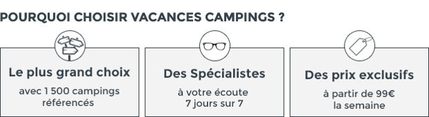| | * Conditions du code promo : Offre valable jusqu’au 28 février inclus. 40€ offerts pour un séjour d'un montant supérieur à 500€ d'achat. Les montants indiqués sont hors frais de dossier et hors assurance optionnelle. Offre cumulable avec les promotions en cours et non rétro-active. En ligne : choisissez votre séjour puis, saisissez votre code promo SOLEIL40 dans le champ requis au moment de la réservation. La remise se calculera automatiquement dans votre panier. Par téléphone : au 02 72 88 03 70 en mentionnant le code promo SOLEIL40. Du lundi au dimanche de 10h00 à 20h00 (prix d’un appel local depuis un poste fixe). Vacances Campings : réservez votre location mobil home en camping. Spécialiste de l'hébergement touristique en camping, nous proposons des locations de vacances à des tarifs négociés. Bénéficiez du plus grand choix de campings en France pour vos prochaines vacances, avec une sélection des meilleures offres dans chaque région : campings en Bretagne, campings en Aquitaine, campings en Languedoc-Roussillon, campings en Provence Alpes Côte d'Azur, campings en Corse. | | | | | |