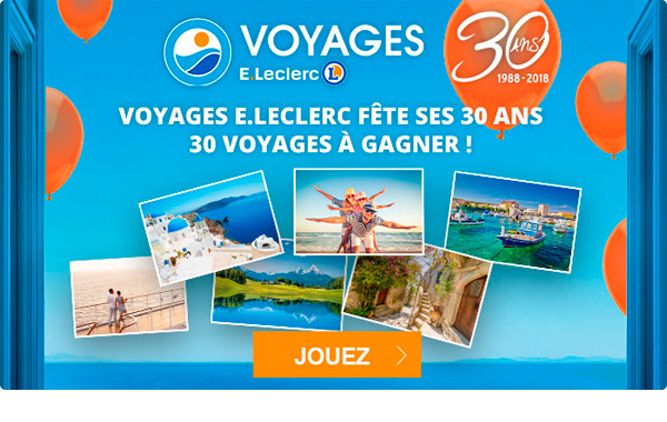 | (1) Prix par personne, à partir de, base chambre double au départ de Paris, Bordeaux et Lyon à certaines dates sur vols spéciaux TUI fly pour le séjour à l'Île d'Eubée, au départ de Paris, Bordeaux, Lyon, Marseille, Nantes et Toulouse à certaines dates sur vols spéciaux Volotéa/Transavia pour le séjour à Corfou, au départ de Paris, Bordeaux, Brest, Clermont-Ferrand, Deauville, Lille, Lyon, Marseille, Nantes et Toulouse à certaines dates sur vols spéciaux ASL Airlines/Small Planet Airlines/Travel Service pour le séjour en Crète, au départ de Paris, Bordeaux, Brest, Deauville, Lille, Lyon, Nantes et Toulouse à certaines dates sur vols spéciaux Enter Air/Travel Service/Aegean Airlines pour le séjour à Rhodes, au départ de Paris, Lille et Lyon à certaines dates sur vols spéciaux TUI fly pour le séjour à Kos. Séjour 8 jours/7 nuits en formule tout inclus et club 4* (normes du pays) sur l'île d'Eubée, Corfou, la Crète, en hôtel 4* à Rhodes et en club 5* à Kos. Taxes d'aéroports et de sécurité et taxe de solidarité obligatoires (70 € vers l'Île d'Eubée et Kos, 105 € vers Corfou, 54 € à 75 € vers la Crète, 112 € de province et 117 € de Paris vers Rhodes, à ce jour, révisables), inclus. Non compris : les dépenses personnelles et les assurances Mondial Assistance. Prix établis au 10/11/17. (2) Prix pour la location d'un cottage comfort 4 personnes pour 4 nuits du lundi au vendredi sur des arrivées en Septembre au center Parcs Les Bois-Francs. Non compris : le transport, les repas, la taxe de séjour, les dépenses personnelles, les assurances Mondial Assistance. Prix établis au 05/02/18. (3) Prix par personne à partir de, base chambre double. Séjour 7 nuits en formule tout inclus. Non compris : les dépenses personnelles, les assurances Mondial Assistance. Prix établis au 13/02/18. (4) Prix par personne à partir de, base chambre double. Séjour 7 nuits en demi-pension. Non compris : le transport, les dépenses personnelles, les assurances Mondial Assistance. Prix établis au 13/02/18. (5) Prix par personne à partir de, base chambre double. Circuit 7 nuits en pension complète. Non compris : le transport, les dépenses personnelles, les assurances Mondial Assistance. Prix établis au 29/01/18. Mentions légales : Leclerc Voyages IM094110026 (siège). Prix sous réserve d'augmentations ultérieures, de modifications des dates de départ et dans la limite des disponibilités. Crédit photos : Center Parcs - Ô Voyages - Héliades - Travel Evasion - Beachcomber - Kuoni - TUI France - Voyamar. Les conditions générales et particulières de vente sont celles des organisateurs techniques : Pierre et Vacances IM075110024 - Thalasso N°1 IM075110150 - Héliades IM013100024 - Travel Evasion IM031100034 - Beachcomber IM075100311 - Kuoni IM093100010 - TUI France IM094130003 - Voyamar IM069100031 - Jet tours IM092100061. Programme détaillé, détail des prestations incluses, suppléments éventuels, conditions générales et particulières de ventes : consulter votre agence Voyages E.Leclerc. Les conditions générales de vente : articles R211-3 à R211-11 du code du tourisme sont consultables dans votre agence et figurent sur votre bulletin d'inscription. Vous désabonner | |||||