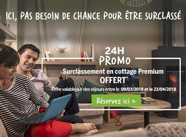 *Offre valable sur une sélection de séjours entre le 09/03/2018 au 23/04/2018 réservée jusqu'au 21/02/2018. Offre valable sur l'hébergement seul (hors frais de dossier, prestations annexes et frais d'acheminement), suivant les dates et catégories de cottages indiquées. Offre soumise à disponibilités selon un stock alloué à cet effet (jusqu'au 30 derniers cottages). Offre exclusivement réservée à des personnes physiques, non rétroactive et non cumulable avec d'autres offres en cours ou promotions. Elle ne s'applique pas à une réservation déjà effectuée ni lors de séjours consécutifs et non échangeable contre de l'argent ou une autre prestation. Vos données ont été collectées et sont traitées pas la Société PV-CP DISTRIBUTION, société appartenant au Groupe Pierre & Vacances Center Parcs. Conformément aux dispositions de la Loi " Informatique et Liberté " du 6 janvier 1978, vous disposez d’un droit d’accès, de rectification et d’opposition aux données vous concernant en nous adressant une lettre à l’adresse suivante: Groupe Pierre & Vacances Center Parcs, Service Relation Client, L’Artois, Espace Pont de Flandre - 11 rue de Cambrai - 75947 Paris Cedex 19. PV-CP DISTRIBUTION, Société Anonyme au capital de 6.055.935€, dont le siège social est sis l’Artois, Espace Pont de Flandre - 11, rue de Cambrai 75947 Paris cedex 19, RCS Paris N°314 283 326 - Licence d’agence de voyage IM075110024 - Garantie financière : B.E.S.V. - R.C.P. : RSA. Crédits photos: ® Pierre & Vacances, Adagio, Center Parcs. |
