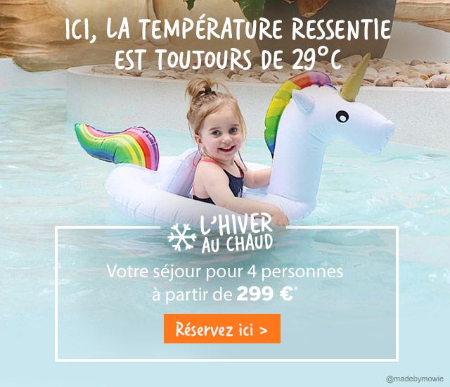 *Exemple de séjour à 299€ pour 4 personnes : week-end 2 nuits du vendredi 09/03/2018 au dimanche 11/03/2018 au domaine du Lac d'Ailette en cottage Comfort 4 personnes. Offres valable sur une sélection de séjours. Offre valable sur l'hébergement seul(hors frais de dossier, prestations annexes et frais d'acheminement), suivant les dates et catégories de cottages indiquées. Offre soumise à disponibilités selon un stock alloué à cet effet (jusqu'au 30 derniers cottages). Offre exclusivement réservée à des personnes physiques, non rétroactive et non cumulable avec toute autre promotion. Elle ne s'applique pas à une réservation déjà effectuée ni lors de séjours consécutifs et non échangeables contre de l'argent ou une autre prestation. Vos données ont été collectées et sont traitées pas la Société PV-CP DISTRIBUTION, société appartenant au Groupe Pierre & Vacances Center Parcs. Conformément aux dispositions de la Loi " Informatique et Liberté " du 6 janvier 1978, vous disposez d’un droit d’accès, de rectification et d’opposition aux données vous concernant en nous adressant une lettre à l’adresse suivante: Groupe Pierre & Vacances Center Parcs, Service Relation Client, L’Artois, Espace Pont de Flandre - 11 rue de Cambrai - 75947 Paris Cedex 19. PV-CP DISTRIBUTION, Société Anonyme au capital de 6.055.935€, dont le siège social est sis l’Artois, Espace Pont de Flandre - 11, rue de Cambrai 75947 Paris cedex 19, RCS Paris N°314 283 326 - Licence d’agence de voyage IM075110024 - Garantie financière : B.E.S.V. - R.C.P. : RSA. Crédits photos: ® Pierre & Vacances, Adagio, Center Parcs. |