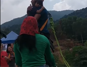 Mohd Redha Rozlan, une star de la téléréalité malaisienne, a réalisé un saut pendulaire avec sa fille de 2 ans, Mecca Mikaela, attachée dans ses bras depuis un pont de 60 mètres de hauteur au-dessus des gorges de Kuala Kubu Bharu en Malaisie.