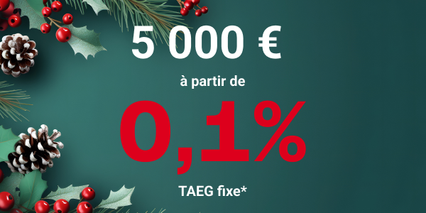 Pour tout emprunt de 5 000 €, bĂ©nĂ©ficiez d'un taux fondant Ă partir de 0,1%*.