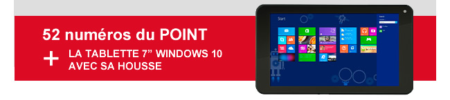 | 52 numéros du Point + la tablette 7 pouces Windows 10 avec housse : 2,49 euros par semaine.En savoir plus. |