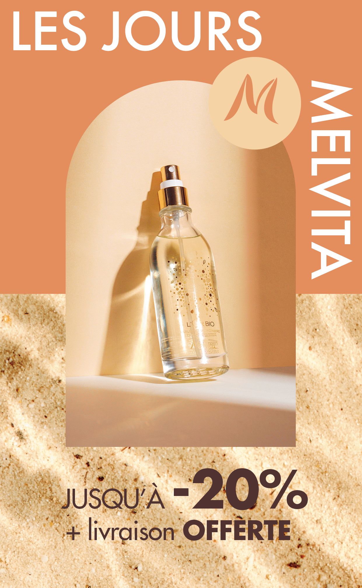 | Pour toute question, notre Service Clients est à votre écoute du lundi au vendredi, de 9h à 18h, par email à contact.fr-fr@melvita.com ou par téléphone au 04 75 37 09 48 (coût d'un appel local). *Bénéficiez de -15% de réduction à partir de 30€ d'achat ou de -20% de réduction à partir de 50€ d'achat (hors coffrets et produits déjà remisés) ainsi que de la livraison standard offerte avec le code JOUR23. Offre valable une seule fois par commande et par client sur fr.melvita.com avec le code JOUR23, du 24/08/2022 au 27/08/2022 inclus. Offre non cumulable avec les offres promotionnelles en cours. Visuel non contractuel. Vous disposez d'un droit d'accès, de rectification, d'opposition, de portabilité, de limitation et de suppression de vos données personnelles auprès de Melvita, responsable de traitement. Pour les exercer, contactez-nous par email (contact.fr-fr@melvita.com) ou par courrier au Service Client (Melvita Service Client, 108 rue de Richelieu, 75 002 Paris). Pour plus d'informations, veuillez consulter notre Politique de Protection de Données Personnelles. Des technologies d'analyses nous permettent, lorsque vous interagissez avec nos contenus, de comprendre votre intérêt pour nos offres et de les améliorer (consulter notre Charte cookies). Pour recevoir tous nos emails, ajoutez contact@melvita.fr à votre carnet d'adresses. |